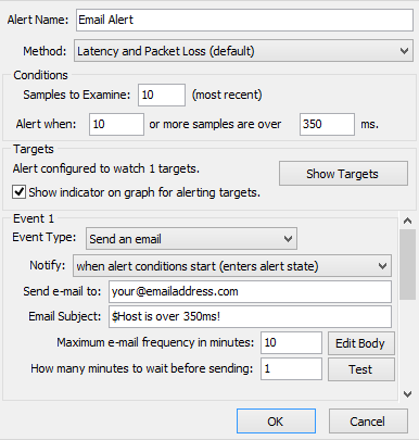 We want to make sure that we don't get flooded with emails if something were to go wrong with one of our targets - so we'll be setting MultiPing up to send us an email when a targets' latency is high, and then send us another email to let us know when it's returned to normal (this sounds quite a bit better than a few dozen "Your target is still experiencing problems" emails, doesn't it?).