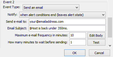 For the first event, set the event type to "Send an email", and set the "Notify" option to "when alert conditions start (enters alert state)." Next, fill in the "Send email to" field (ideally with your email address - but you can enter multiple addresses if you need: just separate each address with a comma or a semi-colon), and enter an email subject (don't forget that you can use variables here too!). Once everything looks to be in order with your first event - go ahead and click the "Test" button.