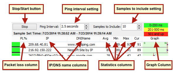 - Packet Loss column: This column shows the percentage of lost packets in the current sample set (current sample set = "samples to include" setting)
