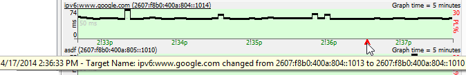 For any target that is being monitored for changes, if/when it does change, a note will be added to the time graph in MultiPing mentioning the original and new IP address.