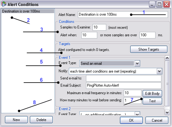 - Run MultiPing and go to the "Edit/Alert Setup" menu. If you've never set up an alert, you won't have any listed here.